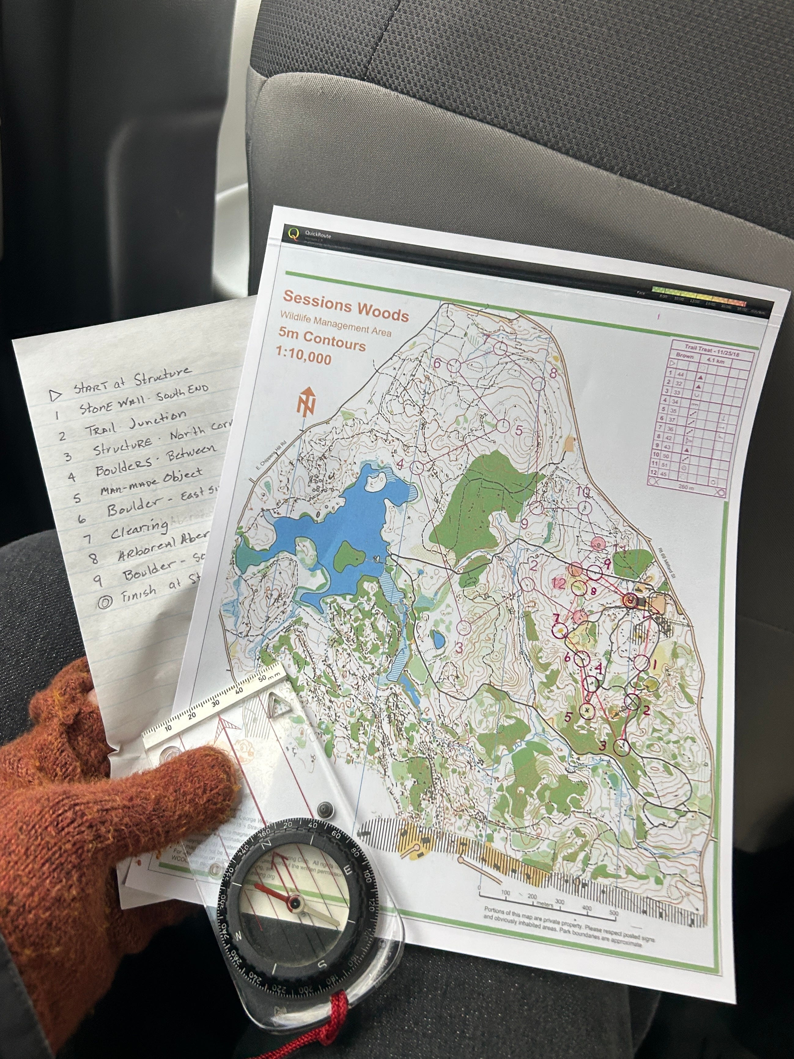 I felt funny standing at the trailhead with a map and compass. We weren’t preparing to step into a vast, untamed wilderness. Families with kids and dogs strolled past us without even glancing up at the map posted on the kiosk, eager to get a leisurely walk in before the big meal. On this Thanksgiving morning, Kate was giving us a beginner lesson in orienteering.